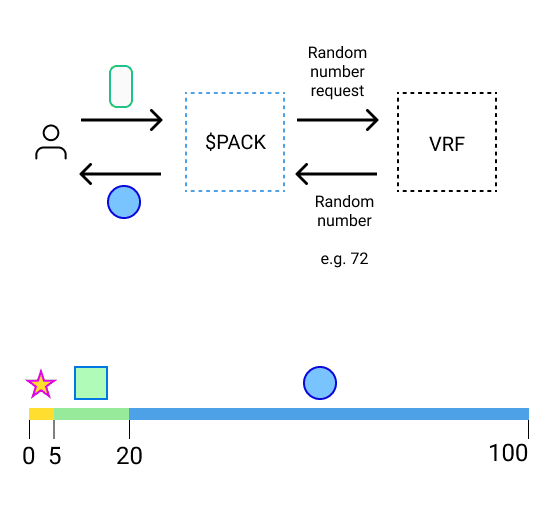contract uses a random number less than 100 to determine whether the pack opener will receive a circle, square or a star.